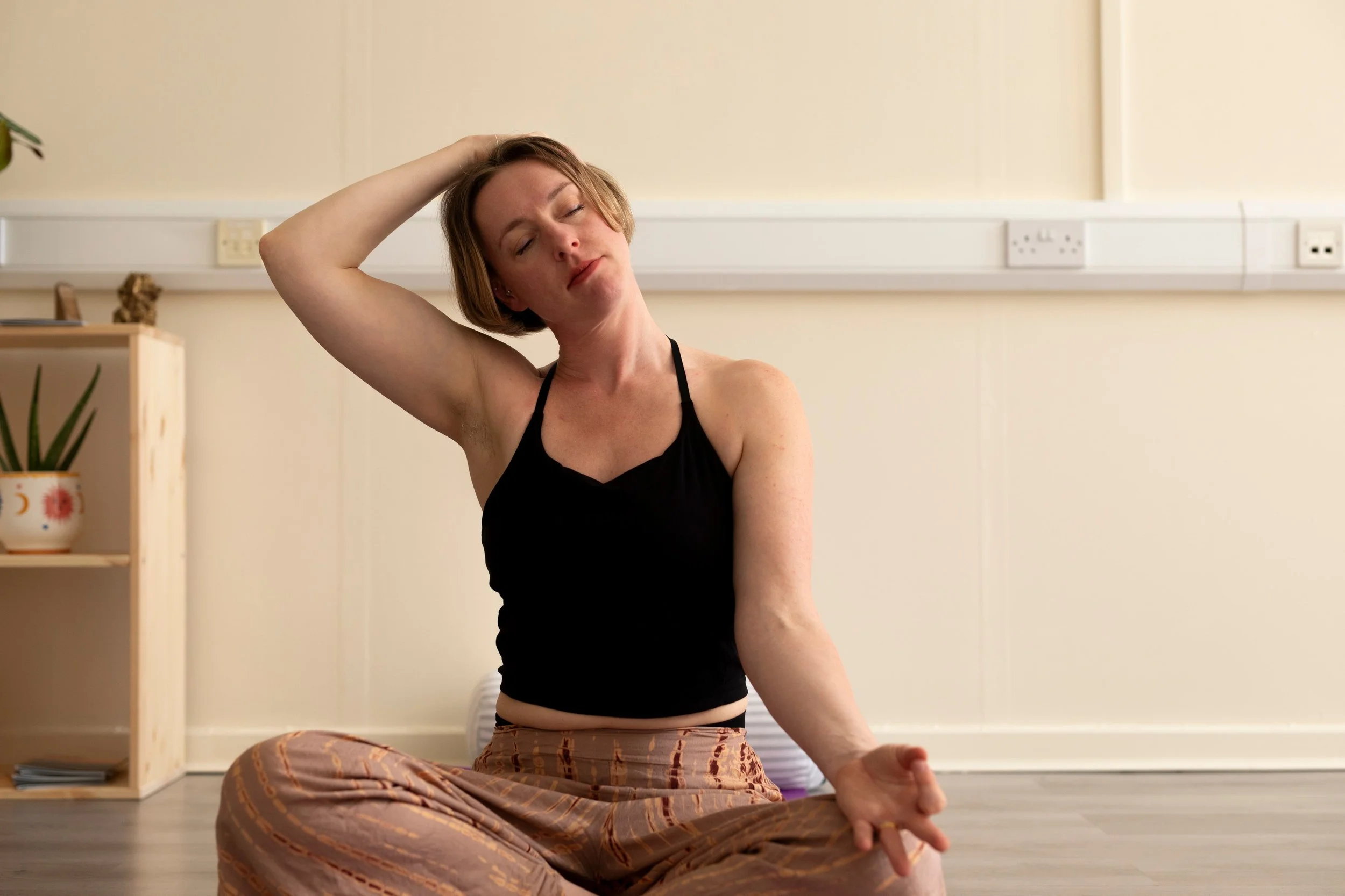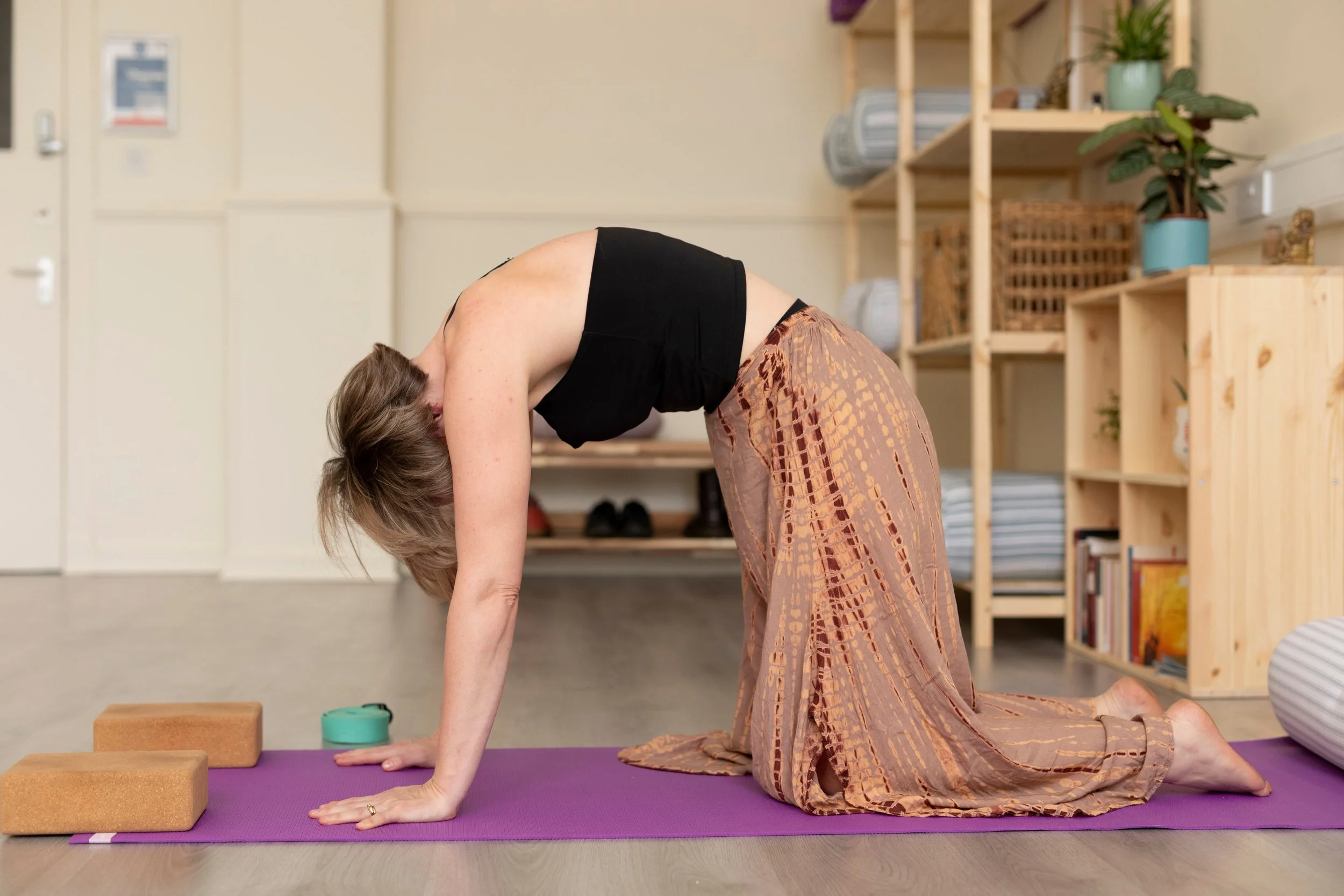 There is minimal getting up and down from the mat, and the practice avoids complex step-throughs or dynamic jumping. Instead, poses are introduced gradually and held with awareness to build strength, mobility, and a sense of groundedness.